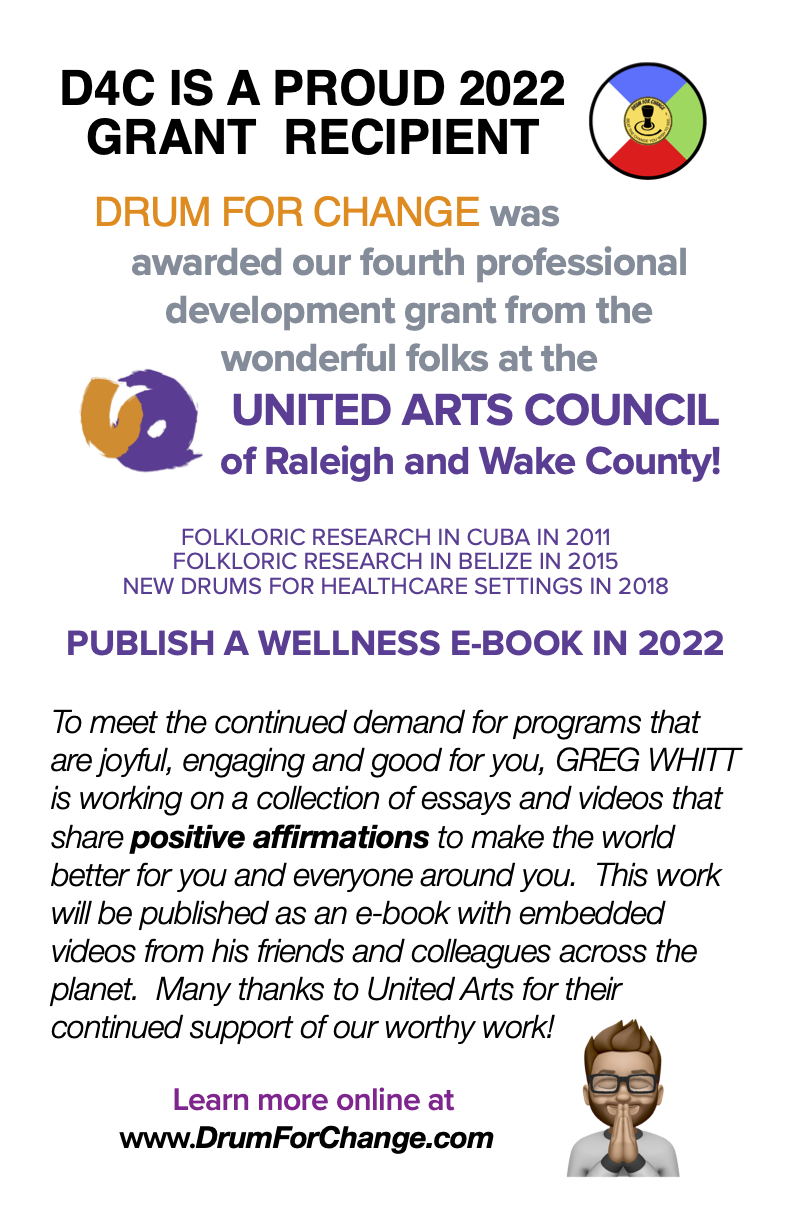 Greg is a popular teaching artist with the United Arts Council of Raleigh and Wake County. They’ve awarded him four professional development grants to support his work. View his directory listing here.